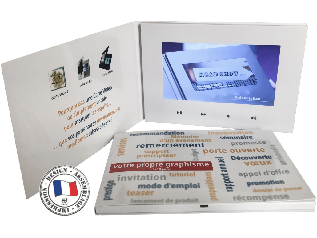 Brochure vidéo A5 écran 7″ – Format hors tous A5 (21×15 cm épaisseur 1 cm)