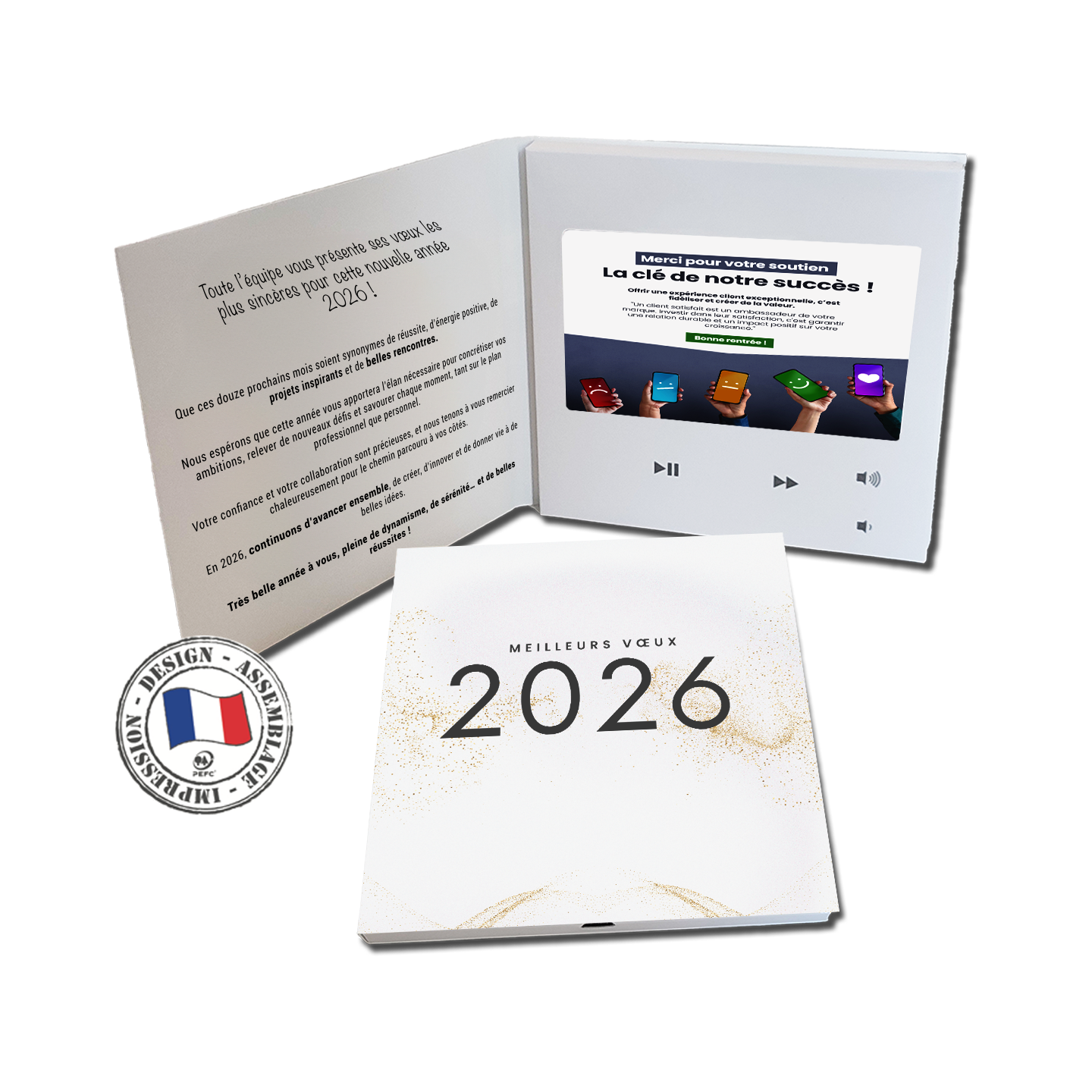 La brochure vidéo Movi-book se présente comme un support imprimé premium qui s’ouvre sur… un écran intégré.